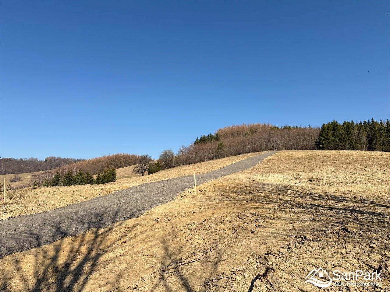 Działka nr 6 pełni funkcję drogi wewnętrznej – kupujący nabywa w niej udział w cenie zakupionej działki. Dojazd do nieruchomości zapewnia utwardzona droga gminna, a następnie droga wewnętrzna prowadząca bezpośrednio do działek.
