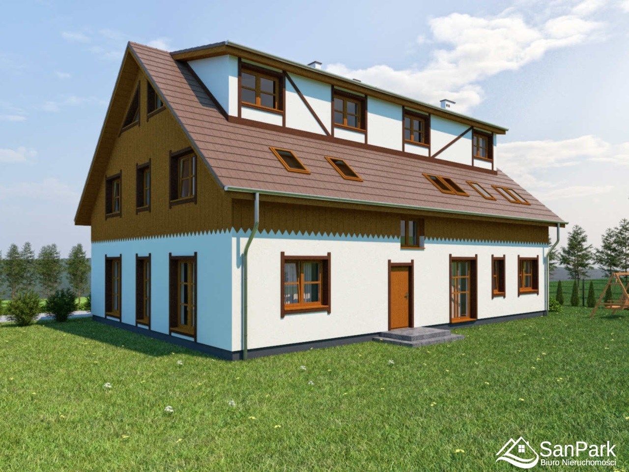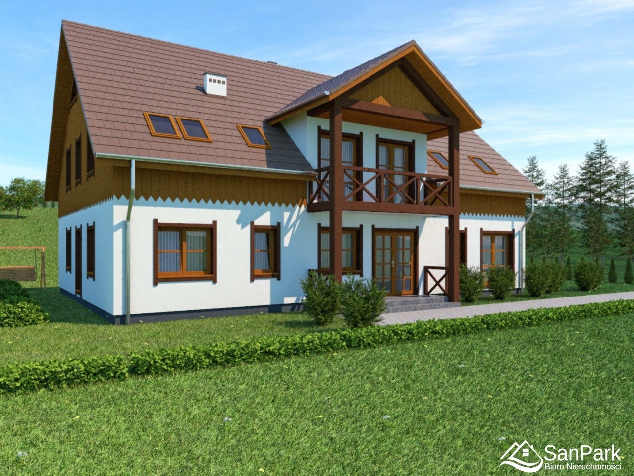 Projekt przewiduje przestronny dom o pow. użytkowej parteru 260 m² , z funkcjonalnym układem umożliwiającym wydzielenie części prywatnej oraz pokoi z łazienkami pod wynajem krótkoterminowy. Bryła w stylu regionalnym, z dużym dachem i drewnianymi elementami, doskonale wpisuje się w górski krajobraz – idealna na dom całoroczny lub kameralny pensjonat.